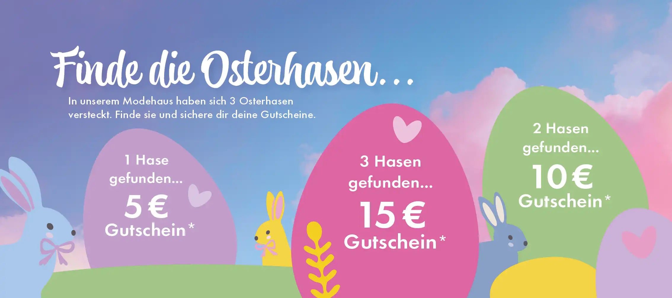 In unserem Modehaus haben sich 3 Osterhasen versteckt. Finde sie und sichere dir deine Gutscheine. 1 Hase gefunden5 € Gutschein für deinen Einkauf ab 50 €. 2 Hasen gefunden10 € Gutschein für deinen...